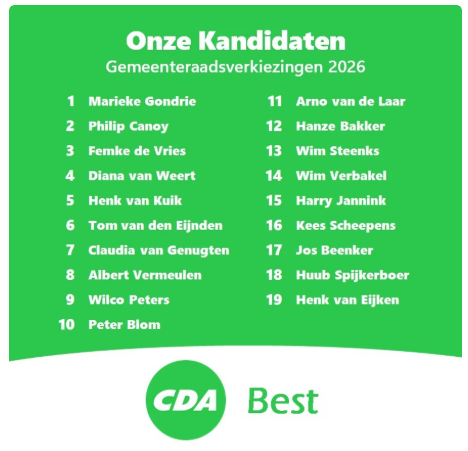 Bij de gemeenteraadsverkiezingen 2026 op 18 maart 2026 staat Gemeentebelangen niet meer op de kandidatenlijst. Een van de oorzaken is dat we geen nieuwe aanwas kunnen vinden, en dat we beter samen kunnen gaan met een sterke partij. Wij hebben naar zorgvuldig beraad intern de overstap gedaan naar CDA-Best. Bij de gemeenteraadsverkiezingen 2026 staat Diana van Weert op plaats 4, Albert Vermeulen staat op plaats 8, Wim Verbakel staat op plaats 14, en Huub Spijkerboer op plaats 18 van de CDA-Best kandidatenlijst 2026.